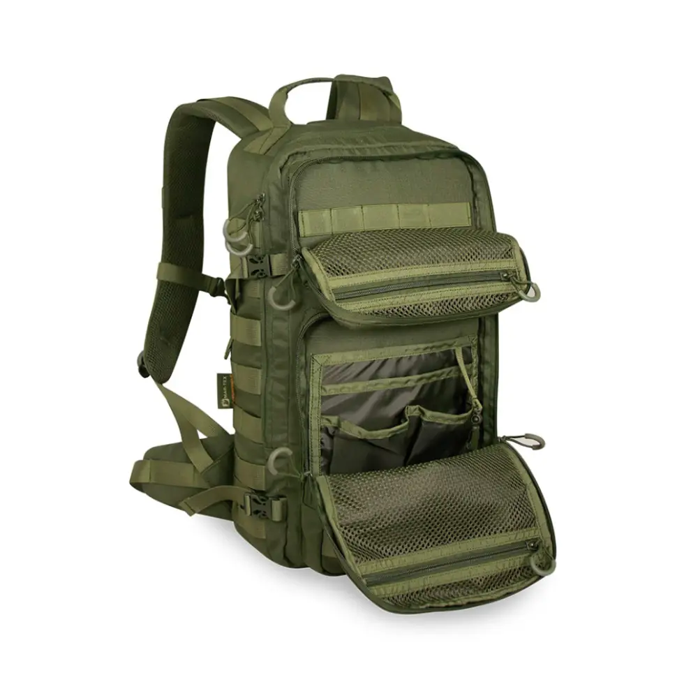 Su diseño incorpora sistema MOLLE frontal, permitiendo ampliar la capacidad con accesorios adicionales. Dispone de múltiples compartimentos y paneles interiores organizadores, facilitando el acceso rápido al equipo.