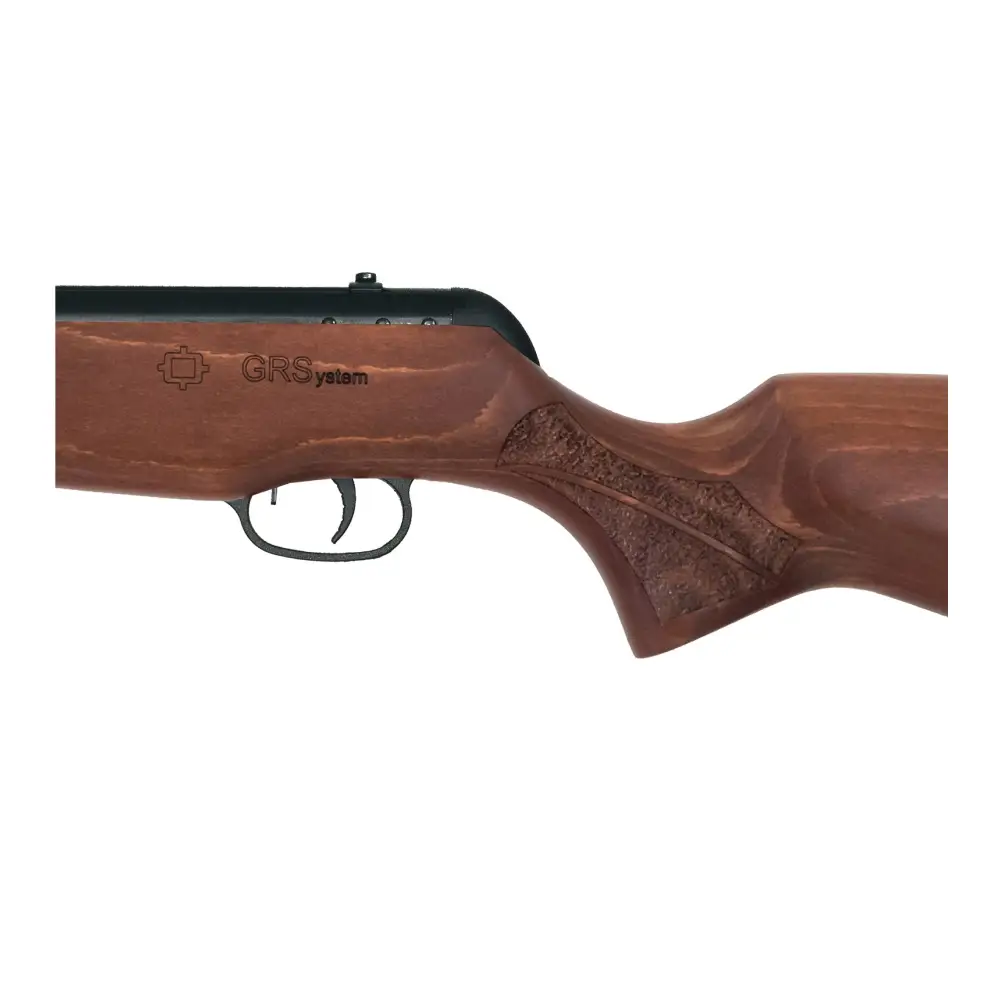 Carabina Norica Hawk GRS Classic con sistema Gas Ram, culata de madera laminada, gatillo ajustable y carril de 11 mm para visor. Precisión y potencia con diseño clásico.