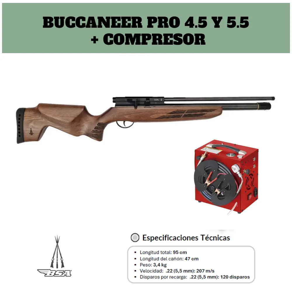 El Pack BSA Buccaneer Pro PCP + Compresor es una solución completa pensada para el tirador que desea iniciarse o evolucionar en el sistema PCP (aire precomprimido) sin necesidad de botellas externas o estaciones de carga.