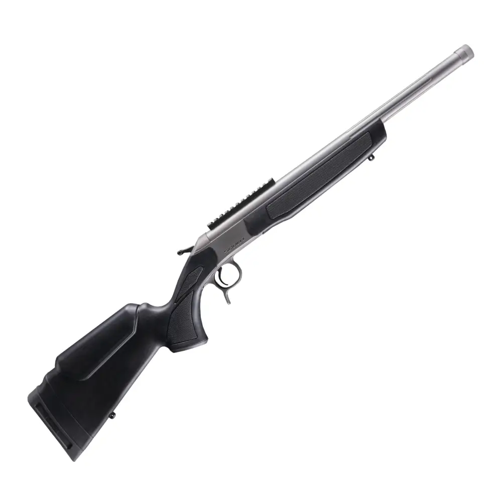 Rifle monotiro CVA Scout TD Stainless con sistema Take Down y cañón de acero inoxidable. Compacto, resistente y fiable para caza en cualquier condición climática.
