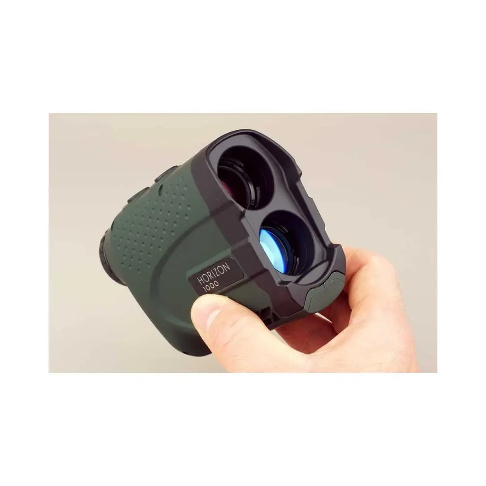 Telémetro láser Horizon 1000 con aumento 6×, alcance de hasta 1.000 m y precisión ±1 m. Mide velocidad hasta 300 km/h, ofrece lectura rápida y diseño ligero, ideal para golf, caza y actividades al aire libre.