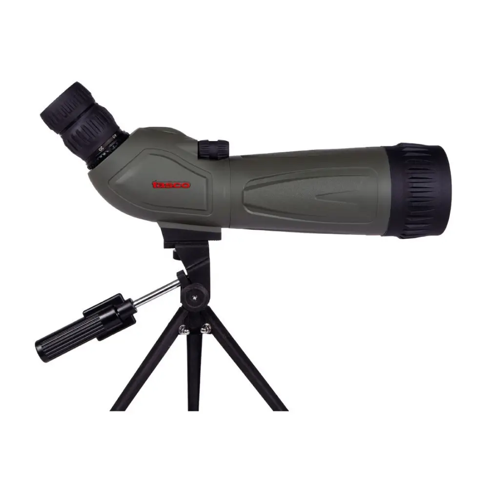 El ocular se coloca en un ángulo de 45 ° con respecto a la lente del objetivo, y todo el cuerpo puede girar de lado a lado cuando está montado en un sistema de soporte para que pueda colocar con precisión el ocular en la posición de visualización más cómoda posible, ya sea que esté viendo de pie, sentado o tumbado. El alivio ocular extralargo y el ocular giratorio hacen que la visualización a través del ocular sea fácil y cómoda, incluso durante largas sesiones de observación. El telescopio está equipado con un soporte de trípode estándar de 1/4 «-20 para que sea compatible con una amplia variedad de trípodes, cabezales y placas de liberación rápida, existentes en el mercado. Este modelo incluye un trípode de mesa compacto con un cabezal de giro e inclinación, con mango para un seguimiento preciso.