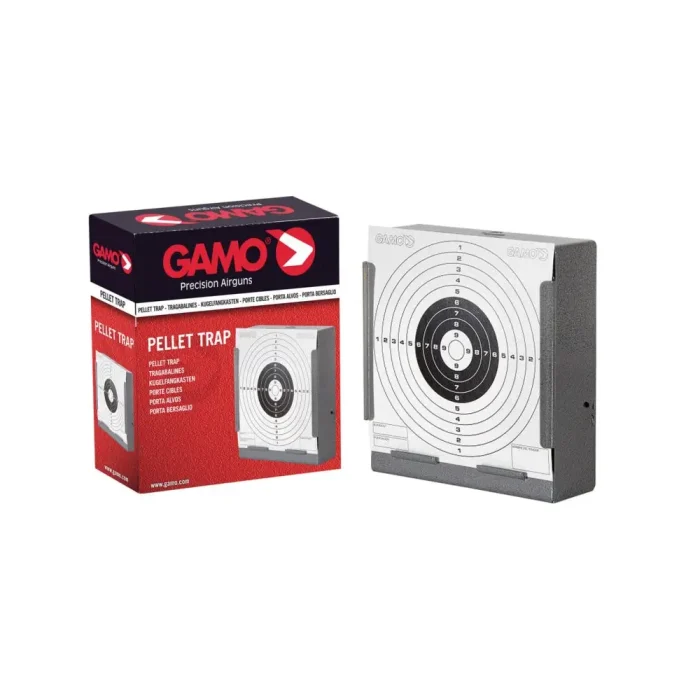 El Tragabalines Gamo es un soporte compacto de acero diseñado para carabinas y pistolas de aire comprimido que sostiene dianas de 14 × 14 cm y recoge los perdigones de forma segura.